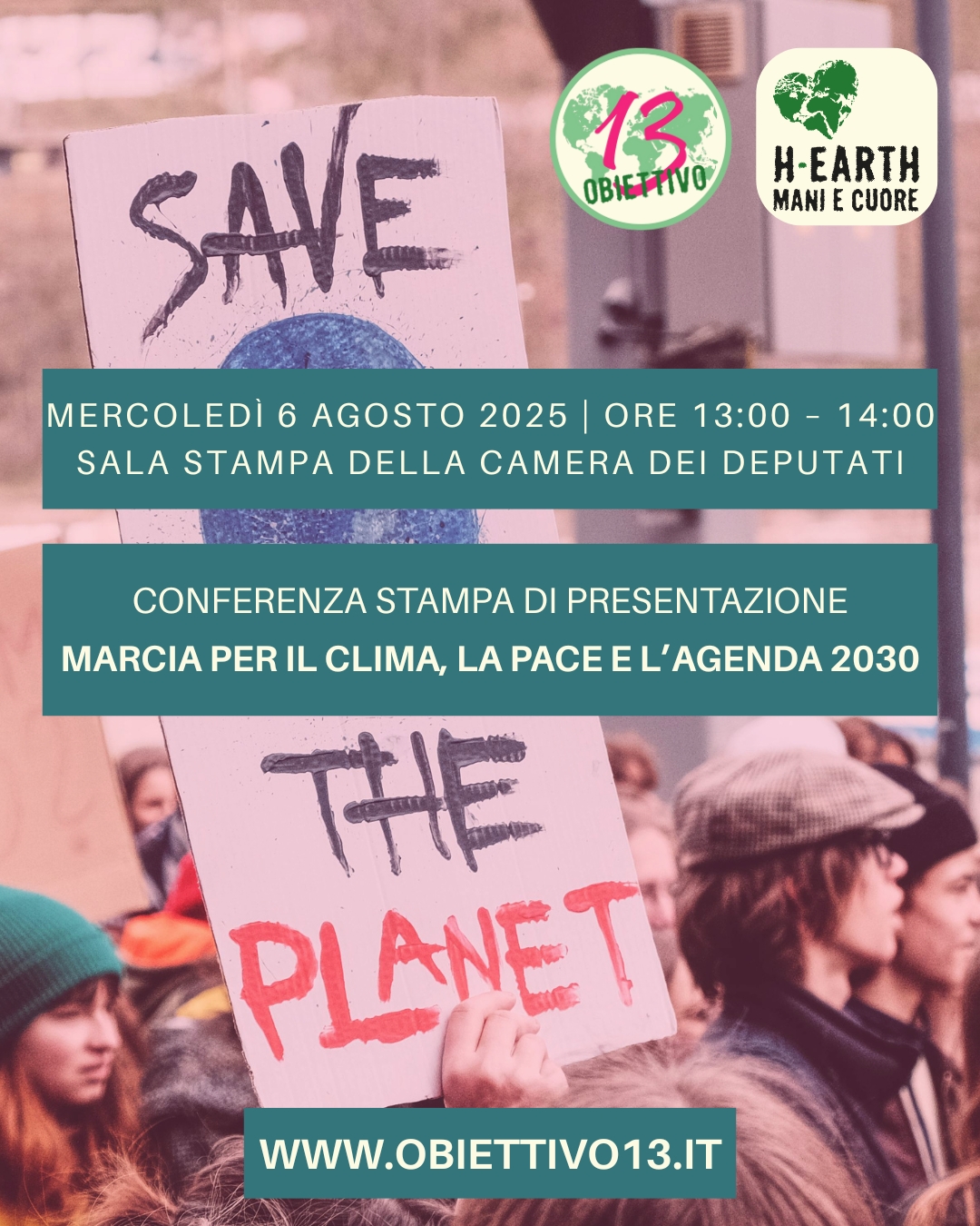 CONFERENZA STAMPA DI PRESENTAZIONE"MARCIA PER IL CLIMA, LA PACE E L’AGENDA 2030"Mercoledì 6 agosto 2025 | Ore 13:00 – 14:00Sala Stampa della Camera dei Deputati L’Associazione H-EARTH Mani e Cuore promuove una conferenza